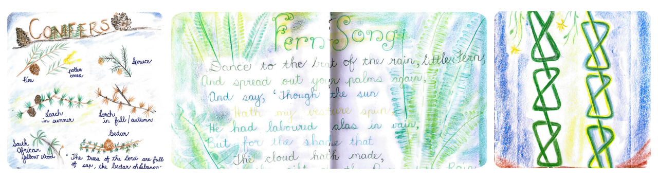 applied in the form of main lesson book work (drawing, writing, recording), beeswax or clay